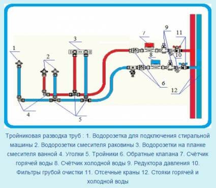 - при прохождении основных труб по полу - водопроводные ветви лучше расположить перпендикулярно вверх, через тройники.