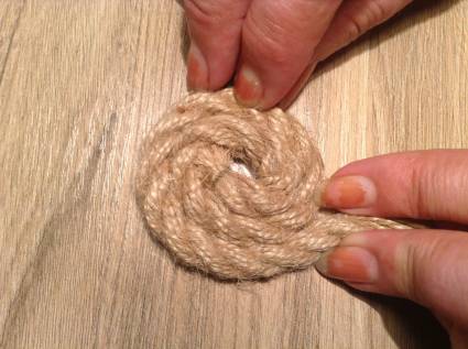 4. Готовим отдельно деталь под названием "спираль". Для этого на плотном картоне, желательно под цвет веревки выкладываем на клей спираль. Когда высохнет — вырезаем. Середину можно украсить камешком, а можно оставить кисточку от веревки — тоже получится хорошо.