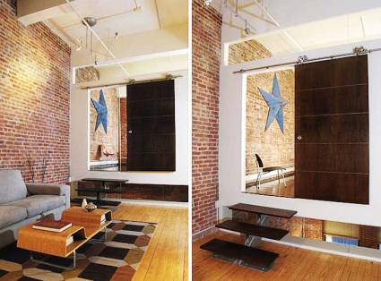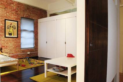Когда владельцы этого Brooklyn дуплекс решили добавить дополнительную детскую комнату для размещения их растущей семьи, это казалось неизбежным, что они должны были бы пожертвовать ощущение простора их чердака, как квартиры. Но благодаря творческой изобретательности дизайнеров Баркера Фриман, компромисс был найден. Решение Баркер Фримана было создать "Floating Room Loft" - частично застекленные куб с раздвижными дверями, который создает распределение места для детей, не нарушая визуальную связь между двумя полами.
