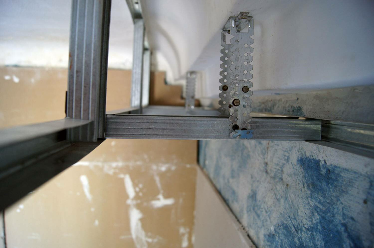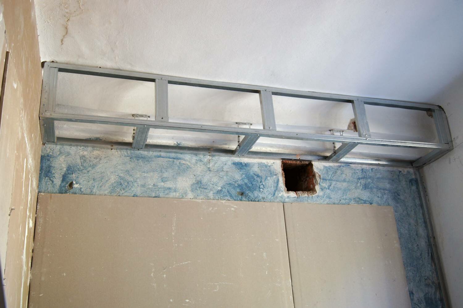 Направляющий профиль будет служить нам перегородкой от окна до другой стены. После установки вставляем вертикальные перемычки из профиля ПП в разрезанные нами пазы и крепим саморезами. Горизонтальны перемычки крепятся так же саморезами, к тому же для усиления конструкции в центральной части профиля ПП закрепил при помощи полосы прямого подвеса к потолку т.к. мне позволял тот самый выступ. Если его нет или он не мешает можно установить прямой подвес.
