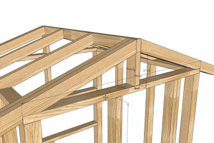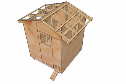 Разрежьте стропила крыши 100 мм х 50 мм, как показано в планах. Там будет 12 в целом, шесть с каждой стороны крыши. Обратите внимание, что существует двойной стропила на каждом конце крыши. Это объясняется тем, внутри верхней части передних и задних стен может быть выложены, что исключает любые высокие уступы, которые могли бы быть проблемой для кур. Сделать дно открытия курица люка не менее 75 мм над уровнем пола.