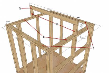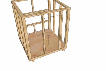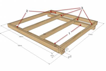 На ровном месте, составляют каркас пола, состоящий из двух концевых балок, двух промежуточных балок равномерно распределенных и двух граничных балки. Конечный результат должен быть квадратом 1800мм х 1800мм. Накройте и закрепите пол фанерой 18мм.