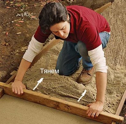 3. Вторым слоем насыпьте смесь из песка и цемента в соотношении 1:3 слоем примерно в 70 мм. После этого разровняйте поверхность при помощи длинного шпателя или ровной доски