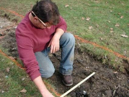 1. Подготовьте поверхность. Предварительно сделав отметки, вскопайте верхний слой земли на глубину в 200 мм. Уберите все корни, а затем утрамбуйте грунт.
