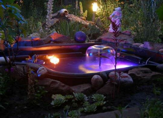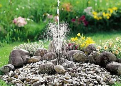 После этого уже можно заняться декорированием. Если вы решили поставить совсем маленький фонтан, то здесь можно обойтись и без насоса. Вместо него мы устанавливаем аквариумную помпу. Чтобы помпы не было видно, мы ее закрываем керамзитом или галькой. Срезаем полиэтиленовую пленку так, чтобы можно было закрыть ею гальку,делаем дырку и выводим оттуда шланг. Сверху можно уложить камни, специальный грунт или другие элементы дизайна. Наполняем чашу так, чтобы водяной насос от аквариума полностью оказался под водой, при этом из грунта создаем некое подобие островка. Подключаем к системе электрический ток.