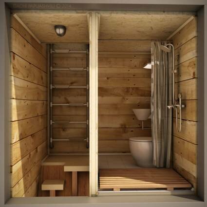 На третьем этаже, в одном жилой площади, есть спальня, кабинет, кухня и столовая (12 кв.м). На четвертом этаже, есть комната для молитвы (4 кв.м). На втором этаже есть био туалет и душ, и, наконец, первый этаж для сохранения солнечной энергии батареи, дождевая водохранилище и склад для продуктов питания.