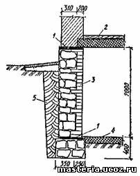 1 - гидроизоляция;  2 - уровень пола первого этажа; 3 - облицовка стены; 4--пол подвала; 5 - глиняный замок