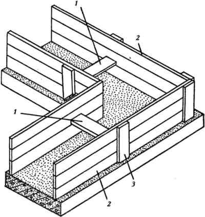 1 - распорки (через 1,5-2 м); 2 - щиты из обрезных досок; 3 - накладки (через 1,5-2 м)