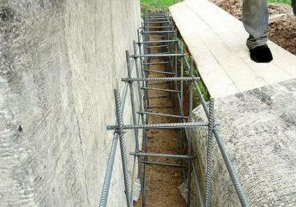 Новый фундамент присоединяется к старому и к этому процессу следует подготовиться. Делаем дырки, чтобы туда можно было засунуть металлическую арматуру. Изготавливаем для основания опалубку, делаем железный каркас и выполняем сцепление с металлической арматурой, которая уже засунута в имеющийся фундамент. Старый и новый фундамент образовали единую конструкцию, которую теперь нужно залить бетоном. Ждем, пока песочно-цементый раствор полностью затвердеет. С одним отрезком мы успешно справились, так что это место закапываем и переходим к другой стене и так по всему периметру. Заливка нового бетонного основания выполняется последовательно, заливку производим каждые несколько метров.