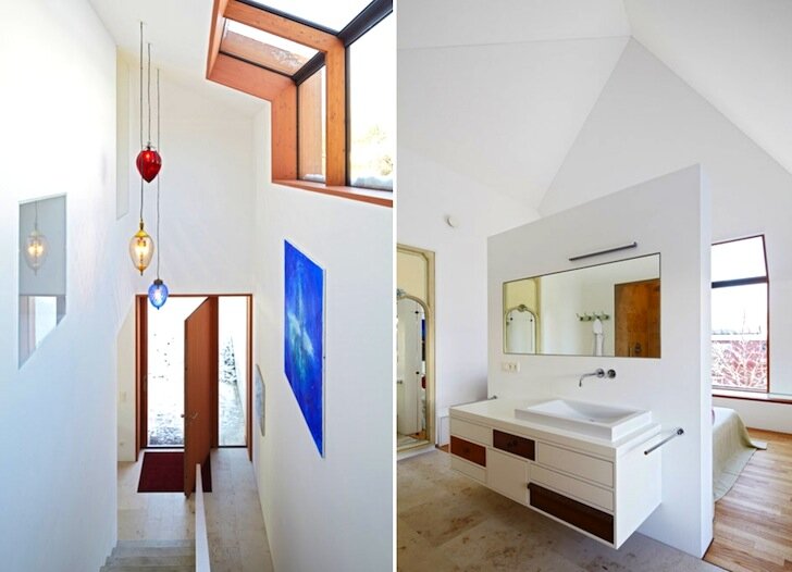 Открытая планировка дома состоит из столовой и жилых помещений, а на верхнем этаже размещаются спальни и кабинет. В рамках своих усилий по минимизации образования отходов строительства и использования материалов, дизайнеры выбрали "однородные" материалы, что не изменило эстетический призыв дома.