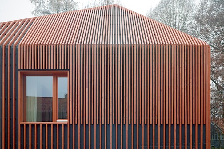 11 × 11, обшит вертикальными ламинированными деревянными рейками, которые выходят на крышу.