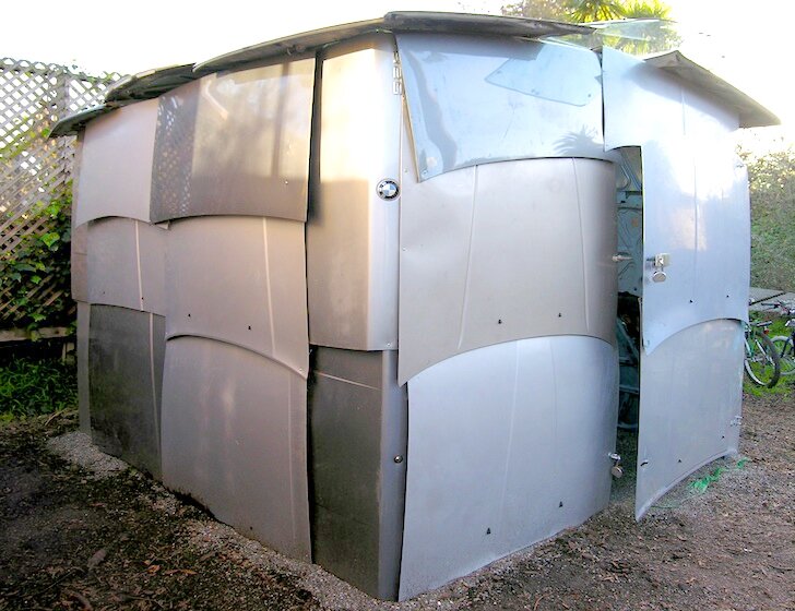 Помещение из старых автомобильных капотов Leger Wanaselja построило эксцентричное помещение полностью из старых автомобильных капотов и других частей. Повсюду в Америке можно увидеть пейзажи старых автомобилей. Держа это в уме, зеленые разработчики Cate Leger и Karl Wanaselja, решили сделать помещении полностью из капотов и ветровых стекол.