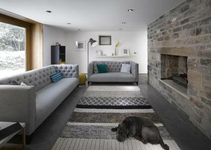 Внутреннее оборудование и отделка были разработаны, чтобы уважать честную утилитарную эстетику старого амбара, и включают в себя каменный камин, на деревянном каркасе окна и насыпной бетонный пол.