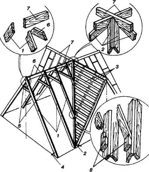 1 - стропило; 2 - ендова (разжелобок); 3 - обрешетка; 4 - скоба; 5 - ригель-затяжка; 6 - коньковые накладки; 7 - конек; 8 - упоры