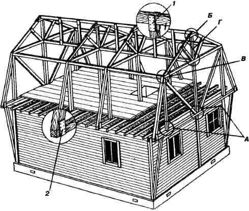 А - узел "балка-стойка-подкосы"; Б - стропильно-коньковое соединение; В - узел "стропило-подкос-стойка"; Г - узел "основное стропило-коньковый брус-подкос";