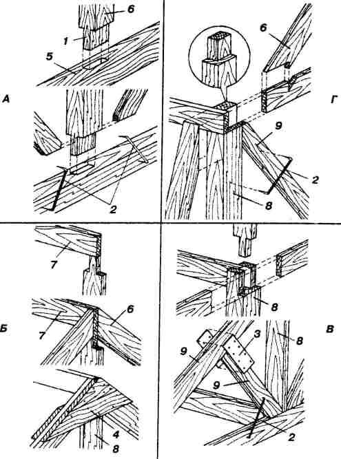 1 - сквозной шип; 2 - скобы; 3 - металлическая накладка; 4 - коньковая накладка из дерева; 5 - балка; 6 - стропила; 7 - коньковый брус; 8 - стойка: 9 - подкосы