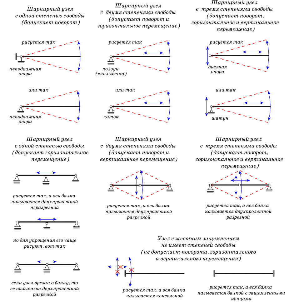 На расчетных схемах в узлах конструкций рисуют кружочки, означающие шарнирное соединение. Шарниры лапками соединяются с условными опорами, по которым можно визуально представить степень свободы узла. Шарнир с двумя заделанными в опору лапками предполагает, что узел неподвижен, но балка может крутиться в шарнире, то есть узел обладает одной степенью свободы — поворотом. Шарнир с лапками, стоящими на скользящей опоре или ползуне, показывает, что узел обладает двумя степенями свободы — возможностью поворота балки и горизонтального смещения. Три степени свободы узла позволяют горизонтальное, вертикальное смещение и поворот, такой узел рисуется просто кружочком и может быть врезан в стержень, обозначающий балку. Если узел врезан в балку, то ее называют разрезной, то есть балки, находящиеся слева и справа от шарнира, с некоторыми допущениями могут рассматриваться как отдельные элементы. Если кружочек (шарнир) нарисован под балкой, то балка, лежащая на нем, называется неразрезной. Шарнир с тремя степенями свободы, врезанный в балку, во многих случаях, делает ее мгновенно изменяемой системой, то есть довольно неустойчивой конструкцией. Узел с нулевой степенью свободы означает жесткое защемление конца балки и запрещает ей всякие смещения: горизонтальное, вертикальное и поворот (рис. 19).