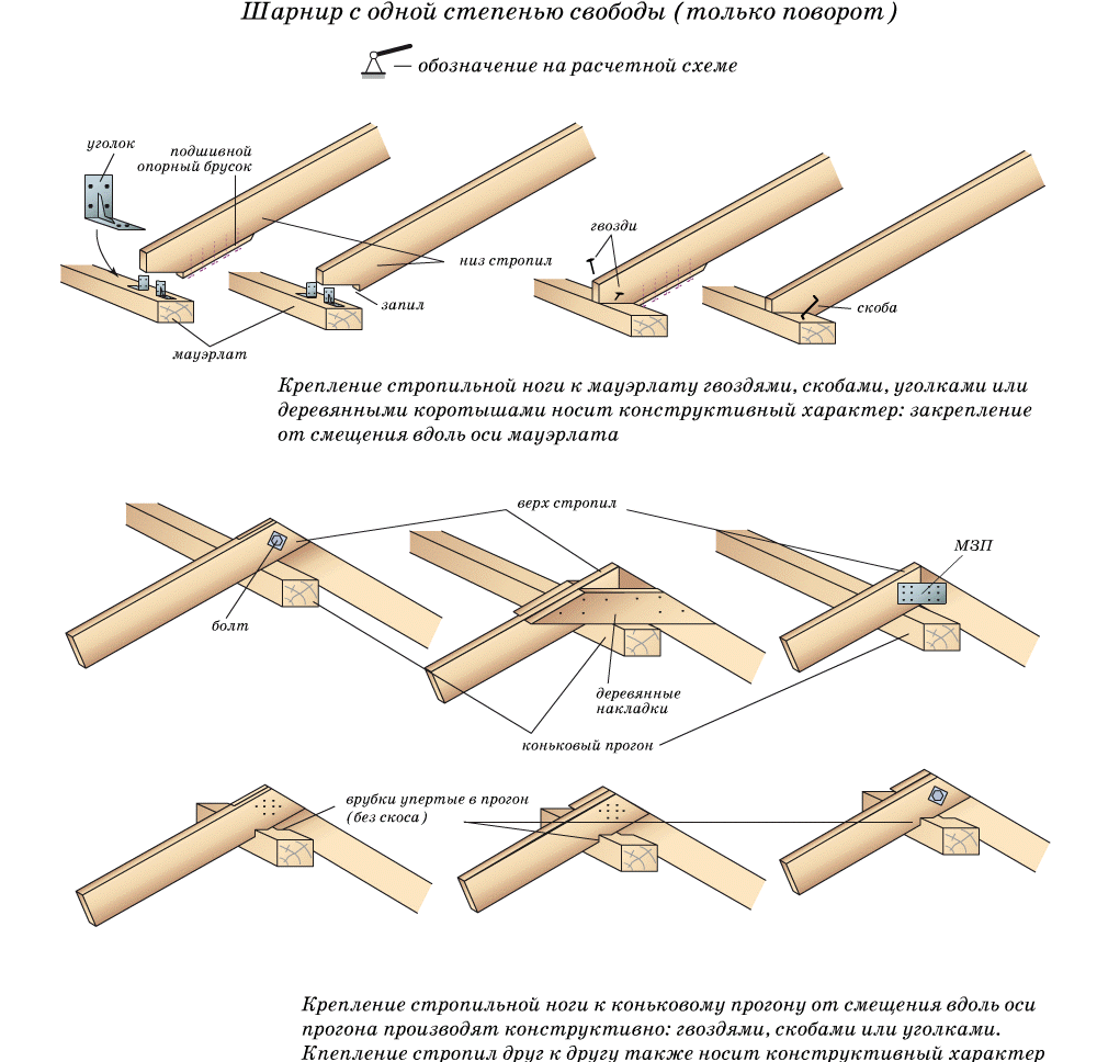 рис. 20.1. Узлы опирания стропил на прогон и мауэрлат. Шарнир с одной степенью свободы (только поворот)