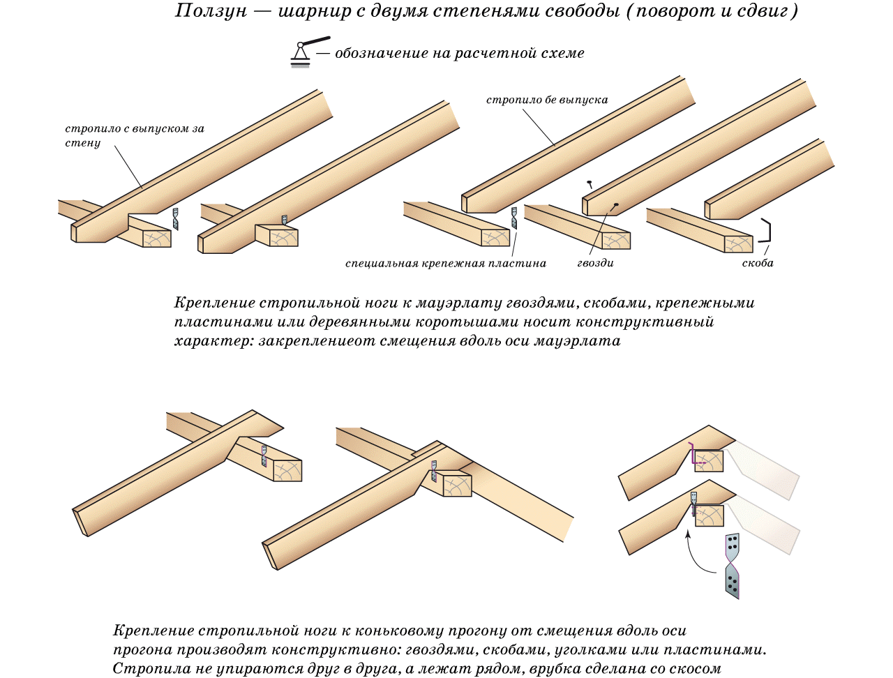 рис. 20.2. Узлы опирания стропил на прогон и мауэрлат. Ползун — шарнир с двумя степенями свободы (поворот и сдвиг)
