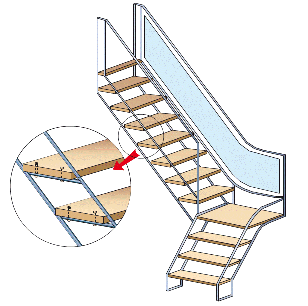 По сути, конструкции этих лестниц не что иное, как модернизированные детские горки, установленные на детских площадках во дворах наших домов, в которых скатывающее полотно заменено на ступени. При использовании поворотных лестниц, во избежание скручивания лестницы от внешней нагрузки, междуэтажную площадку нужно подпирать стойками или крепить к стене дома. Узлы нижнего и верхнего закрепления лестницы также нужно решать индивидуально: использовать стойки либо крепить болтами к балкам перекрытия этажей.