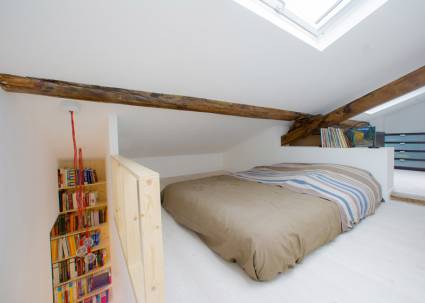 Наверху чердак спальня, с низкой кровати, расположенной под наклонным потолком, в котором есть деревянные балки и мансардные окна. Гардеробная с мебелью находится позади кровати, .