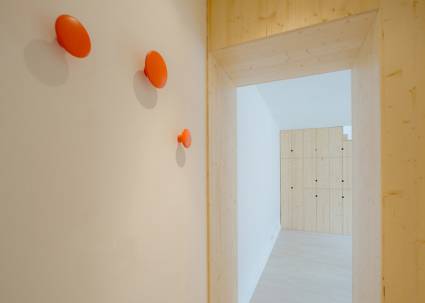 Оранжевый цвет используется по всей квартире. Лестница с хранения становится распространенным способом для экономии места в небольших домах, а также обеспечивает возможность в минимальных интерьерах.