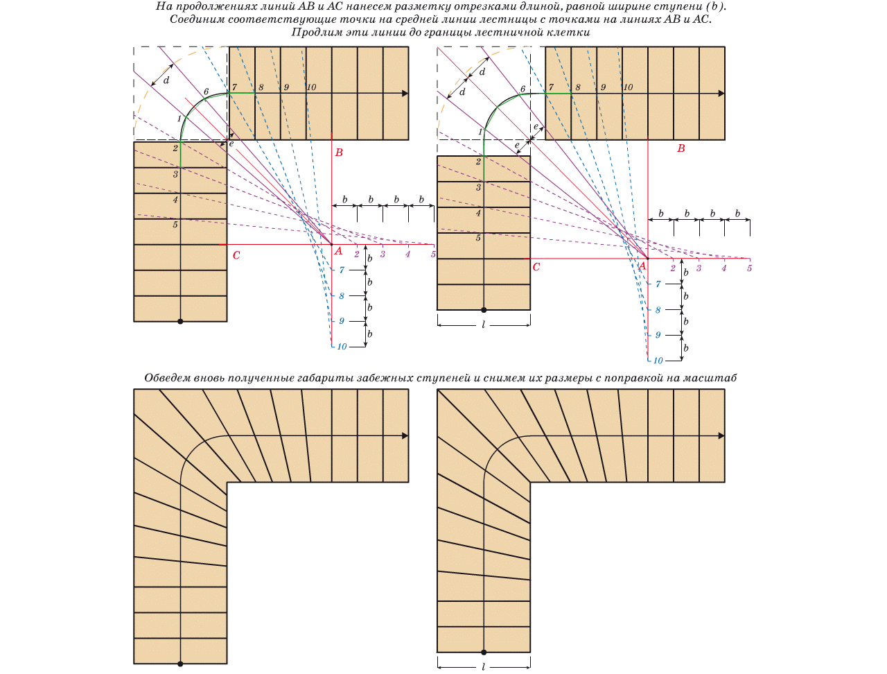 Лестницы с радиальным поворотом марша сложны для изготовления, для них нужно изготавливать гнутые косоуры, тетивы или делать под ступени другие опоры, повторяющие радиус изгиба лестницы. Поэтому, поворотные лестницы с забежными ступенями чаще изготавливают без радиуса изгиба, а просто с прямым поворотом на 90°. Расчет размеров таких лестниц ведется графическим методом пропорций. Поскольку лестницы с поворотом на 90° более технологичны в изготовлении и могут быть сделаны в домашних условиях, приведем этот расчет полностью. Вся последовательность отрисовки плана лестницы изображена на рисунке 10.