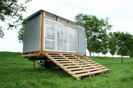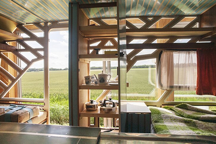 Крошечный колесный приют оснащен выдвижной деревянной лестницей, заключенная в рамки, и его можно транспортировать с помощью стандартного фермы прицепа.