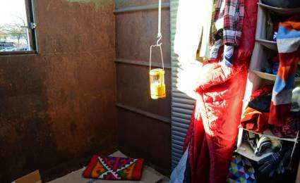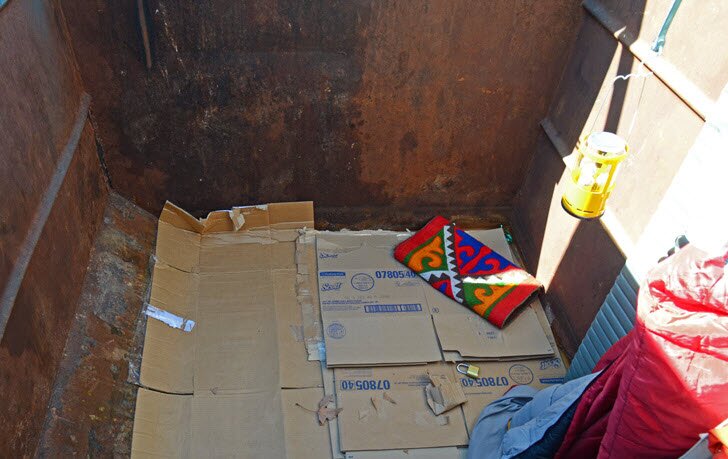 Ввод дома Джеффа требует практики. Сначала он должен разблокировать замок на горизонтальной сдвижной дверце, использует стул, чтобы открыть верхнюю крышу, а затем подняться в свой ржавый интерьер. Помимо новой крыши, что не протекает, хет стойки, структурные модификации были сделаны к мусорному контейнеру, к концу годичного эксперимента, дом Джеффа может стать не только в мире наиболее обманом, но одним из самых умно разработанных крошечных домов, доступных в любом месте. И в самом деле, это то, что делает науку и дизайн образования удовольствие и заставить людей думать о том, что они действительно должны привести удовлетворение жизнью.
