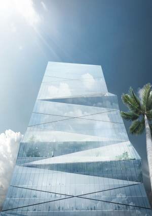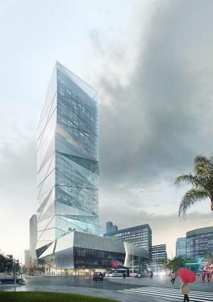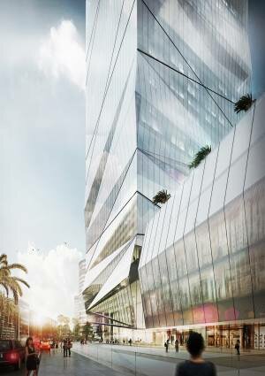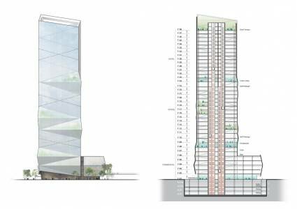 "Башня состоит из пятиэтажного подиума для просторных розничных галерей, ресторанов, офисных блоков на середине высоты и отель на верхнем этаже", описал архитектор.