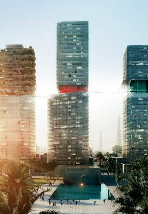 Нижние части башен комплекса обеспечит пространство для жилых районов и гостиниц. В верхней части каждой башни будет предназначены для более общественных функций, таких как бассейны, сады и бары, подключенных через висячие мосты между башнями.