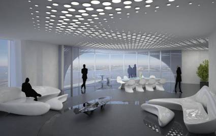 Подиум будет функционировать как космическое сообщество башни. Формально, это скульптурное расширение башни, которая будет представлена элементами ландшафта разработанной в рамках водных объектов и различных бассейнов, саун и кабинками для переодевания. Крыша состоит из нескольких функций на различных уровнях. Наряду с вертолетной площадкой, будет также иметься плавательный бассейн, бассейн и солярий, и частные пространства обеденные зоны.