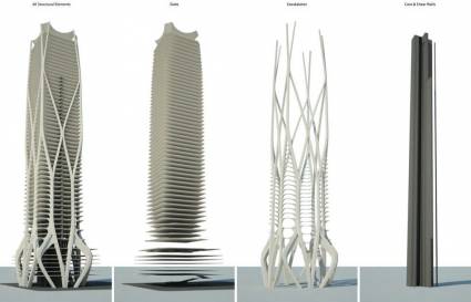 Структура башни, массивный бетонный экзо-скелет, резко контрастирует с тонкой и прозрачной системой остекления.
