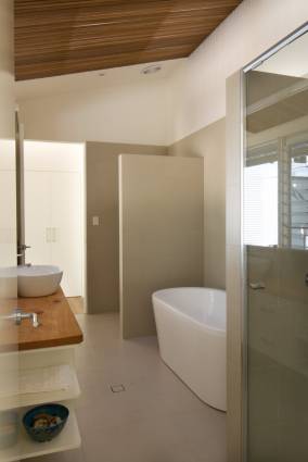 Высокие окна и большие карнизы позволяют фильтровать день освещение в здание, избегая необходимость поверхностных источников света. Поли листы карбонат крыши, выложенные деревянными балками в нижней части помогают этой функции в ванной. Планки из твердой древесины столярные (местного производства) смягчают жесткие края.