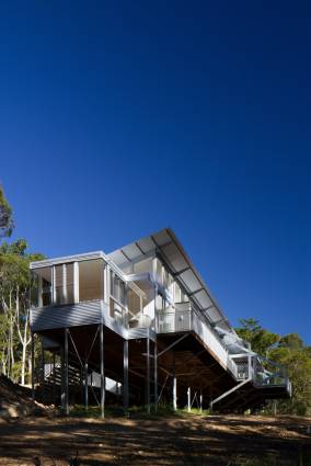Эта система позволила дом сделать конструкции кантилевера или плавать в направлении вершины деревьев. Стальной листа расположенный горизонтально был выбран для облицовки, чтобы противопоставлять по отношению к вертикальной природы и цвета окружающей растительности.