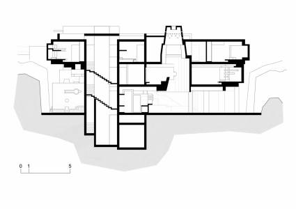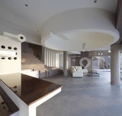 Социальная область на террасе плавательного уровня бассейна на возвышении, высеченных в холме, имеет стеклянную оболочку, что на основе железнодорожной системы, позволяющей все разделы собрать вместе на северной стороне дома, делает интегрированные пространства гостиная, кухня с террасой и бассейном.