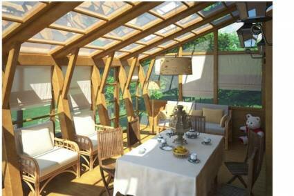 2. Веранда – это полностью закрытое холодное помещение,где нет отопления, застекленное с 3 сторон. Главное отличие от террасы то, что она всегда полностью пристраивается к дому. Её даже встраивают в сам дом. Веранда строится из того же материала, что и дом .