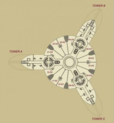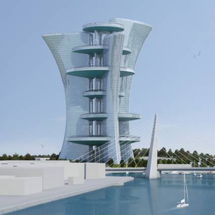 Центральное здание состоит из шести дисков, которые соединяют и поддерживают три башни разной высоты. Самый высокий раздел имеет высоту 250 метрах и 65 жилых этажей в которых квартиры площадью от 50 квадратных метров до 400 квадратных метров, комплекс также может похвастаться отелем с 470 номерами. Самая высокая башня расположена на 55 градусов по часовой стрелке по отношению к географическому северу, биссектрисы между этой башней и башней следующий наименьший часовой стрелке указывает в направлении Венеции и открывает панорамный вид. Плавательные бассейны, сады и пруды будут расположены на верхних палубах, вертолетная площадка будет располагаться на центральной крыше.