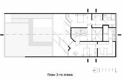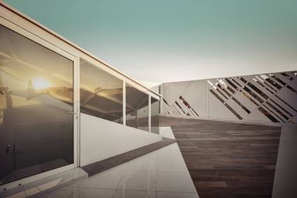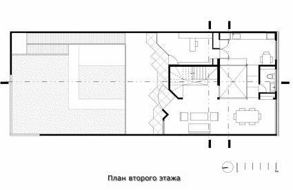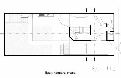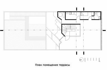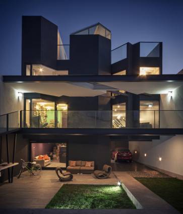 Повышенная терраса на задней части дома находится в гармонии с первоначальным объемом, который состоит из серии высоких стен, поворачивающиеся на 45 градусов, с другой стороны террасы полностью ортогонально практически завершает мега окно.