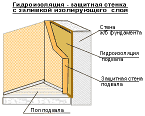 Если несущие стены выполнены из бетонных блоков, то защитные стенки выкладывают на расстоянии 4-12 см от гидроизоляции. Заполняя получившийся при этом зазор цементным раствором из портландцемента с добавками.