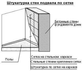 Штукатурка внутренних стен подвала работает "на отрыв" - поэтому её армируют стальной сеткой.