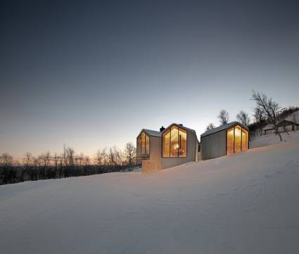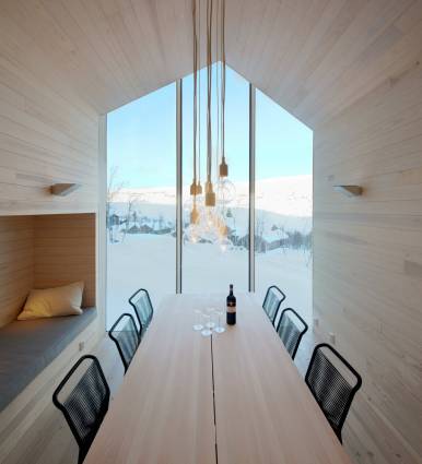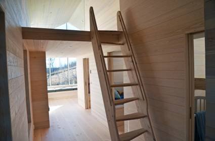 Кабина вводится под консольным остеклением объема в зале с полированной на месте бетонного пола, функционирующий в качестве промежуточной зоны, чтобы убрать лыжные ботинки и верхнюю одежду. Деревянная лестница поднимается от низкого подвала и выходит на щедрое пространстве жилых помещений, увенчанной сложным высоко скатным потолком. В основе дома отдыха, где отдельные крылья ответвляются от основного корпуса в плане, является кухня. Его столешница из железобетона стекловолокна в виде консоли в центре пространства и якорь двустороннего камина на другом конце.