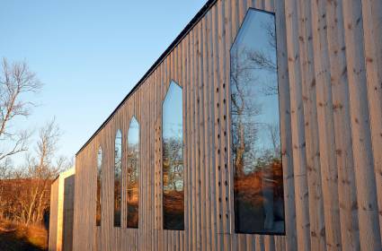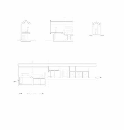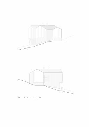 Ответ архитекторов был таков, прозрачная кабина и чистое выражение в непрерывном коже древесины с облицовкой на наружных стен и крыши, которые будут приобретать серый налет со временем. Объем состоит из основного корпуса, жилье в основном спальни. Этот сдвиг в программе, и использование нескольких уровней позволяет здание приспособиться к наклону узла.