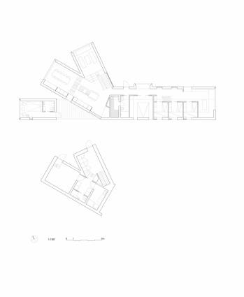 Через раздвижные двери по коридору узкого основного корпуса каждой из спален, а также ванная комната с сауной. В главной спальне открывается окно двускатно-образный, экструдированного через боковую стенку для перспективы на ночном небе, в то время как каждый из детских спален есть двухъярусная кровать чердак для посещения друзей. В дальнем конце зала гостиная для молодежи и накладные мезонин с видом через остекление фронтона прямо на горнолыжном склоне.