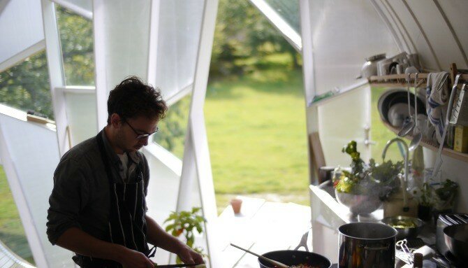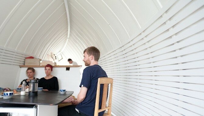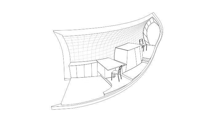 Небольшой 25 квадратный дом имеет сложный деревянный пол и криволинейную поверхность. Дом достаточно большой, чтобы комфортно разместить двух человек, с достаточным местом для гостей. В небольшом пространстве встроена центральная кухня, столовая, гостиная, прихожая, спальные помещения и открытая терраса.