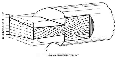 Начинают рубку с того, что торцы бревен тщательно размечают, начиная с бревна, у которого вершина в верхнем отрубе имеет самый маленький диаметр. Это бревно в последующем должно стать эталоном и по размеру его "лапы" должны размечаться торцевые части остальных бревен. Нужно отметить, что отклонения в разметке "лапы" может привести к нарушению вертикальности углов сруба и их герметичности.