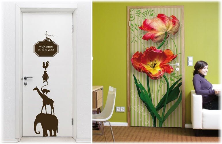 Помимо этого, сделать дверь красивой можно при помощи специальных наклеек, это самый легкий и простой способ. Стоят такие наклейки очень дешево и найти их можно везде. Их легко будет сменить на другие, когда старые вам надоедят.