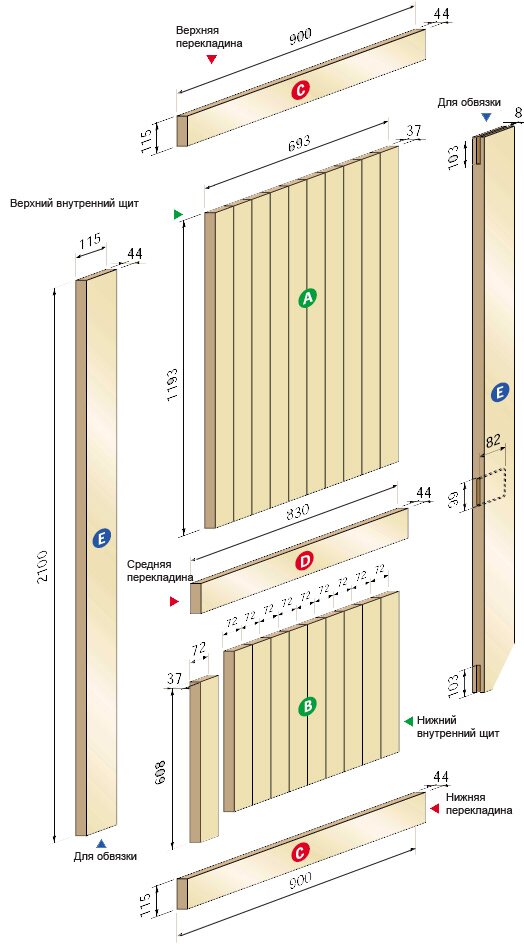 Как делают двери или как самому сделать, вы узнайте из данной статьи. Размер двери 2100x900мм если вы хотите сделать больше или меньше по размерам, просто вычислите размеры.Для начало панадобиться определенное количество совершенно готовых деревянных панелей со следующими размерами: