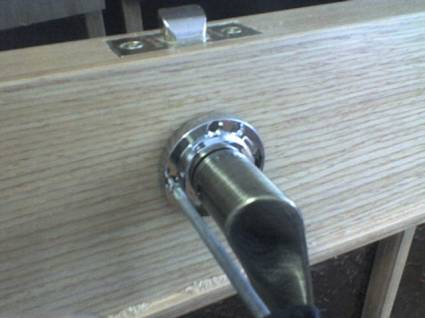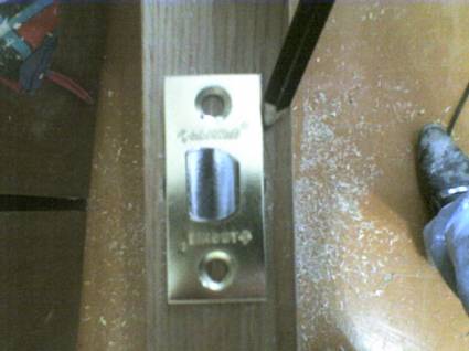 Крепим саморезами замок, далее устанавливаем дверную ручку, также не забудьте, отмерив середину язычка замка на дверной коробке установить запорную планку. Для этого просверлите отверстие под язычок замка и прочертите линию вокруг запорной планки, затем уберите стамеской лишнее, чтобы утопить запорную планку заподлицо двери.