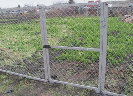 5. Между стойкой короба и рамой калитки справа поставьте в сомкнутом виде два навеса на расстоянии от верха и низа калитки 30 см. Навесы должны быть установлены так чтобы , чтобы полотно вашей калитки довольно таки легко, без труда снималось.